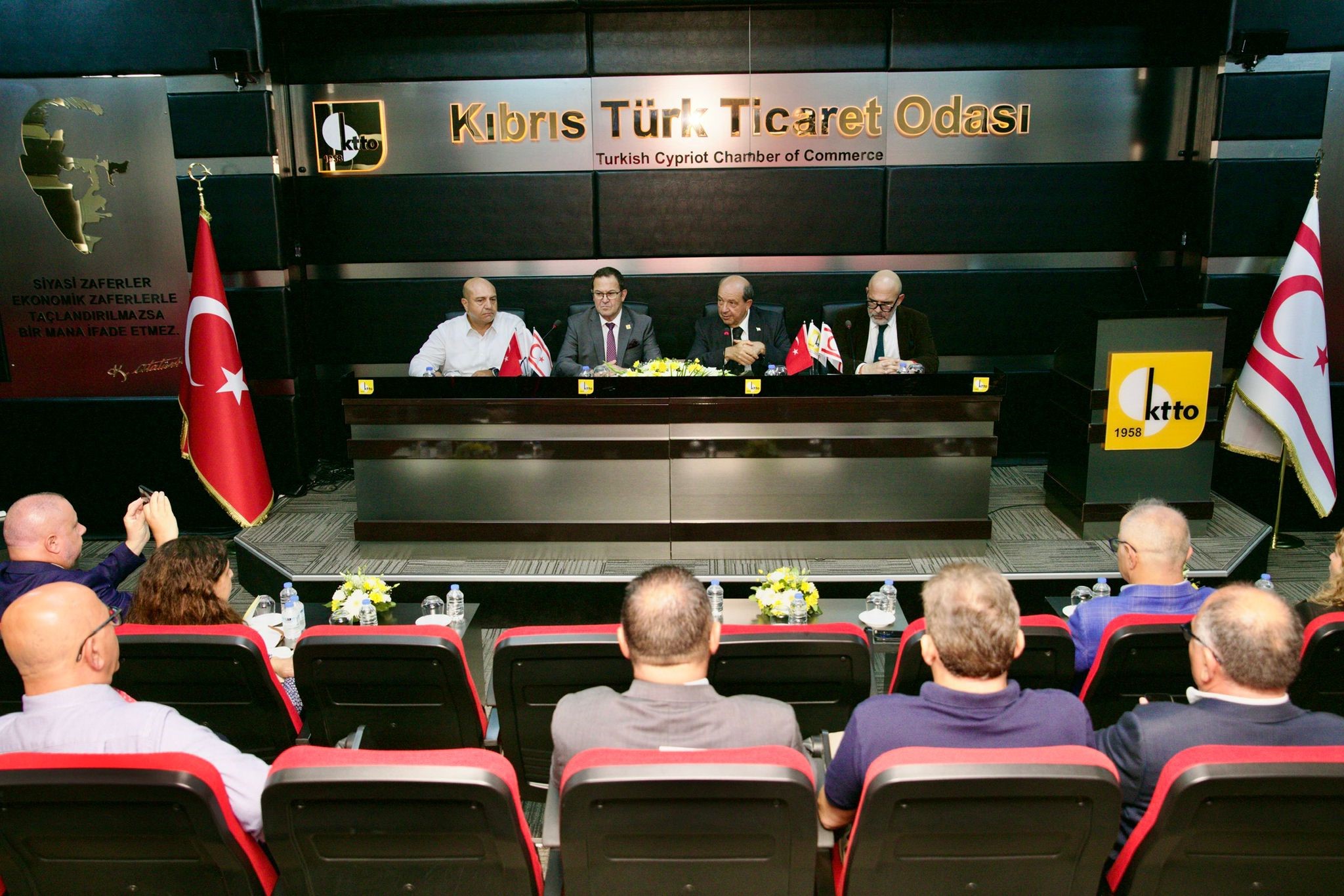 Cumhurbaşkanı Ersin Tatar, Cumhurbaşkanlığı müzakere heyetiyle birlikte Kıbrıs Türk Ticaret Odası’nı (KTTO) ziyaret etti, Kıbrıs sorununda yaşanan gelişmeler hakkında bilgi verdi.